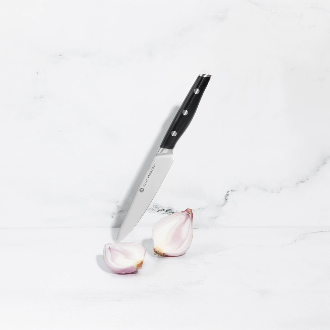 El Royal Prestige® Utility Knife es una versión más pequeña del famoso Royal Prestige® Chef’s Knife. Te ayudará a cortar y picar los ingredientes más pequeños con mayor facilidad para preparar tus recetas favoritas. Su versatilidad no tiene igual y su mango favorece un agarre profesional de manera más cómoda, lo que reduce la fatiga al usarlo por mucho tiempo. Sin duda este se volverá tu cuchillo favorito para el uso diario en la cocina.
