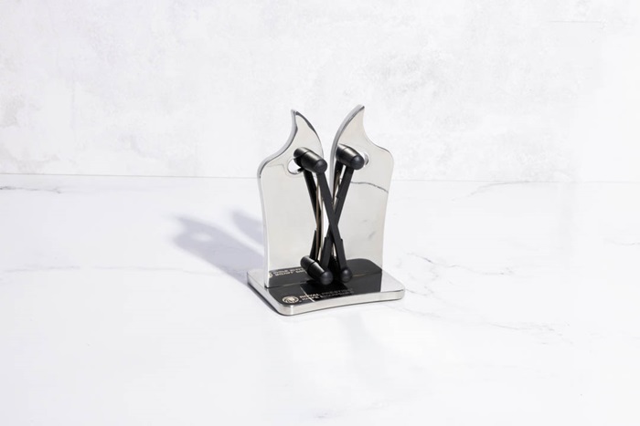 De diseño innovador y elegante, el Royal Prestige® Knife Sharpener te ayuda a mantener tus cuchillos listos para usar, permitiéndote afilar, alinear y pulir todo tipo de cuchillos, ya sean de hojas lisas o serradas. Su sistema de mariposa se ajusta automáticamente para adaptarse a los ángulos de la hoja.