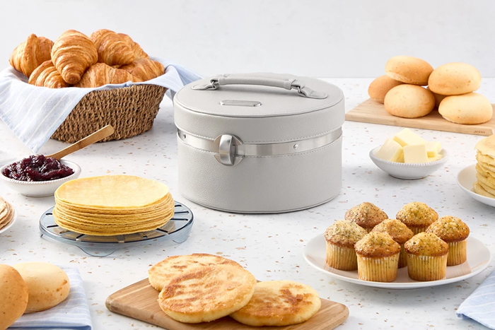 It’s time to unite your tradition with our innovation. This tool keeps your food at the ideal temperature thanks to its technology and portable battery—or if you prefer, with a charging cable. Its compact design makes it easy to bring along to gatherings and celebrations. Perfect for tortillas, it’s also compatible with arepas, pancakes, croissants, mini muffins, pão de queijo, and more. The latch seals in heat, keeping your tortillas soft, flexible, and free of moisture. The anti-humidity rack ensures they stay fresh and delicious.